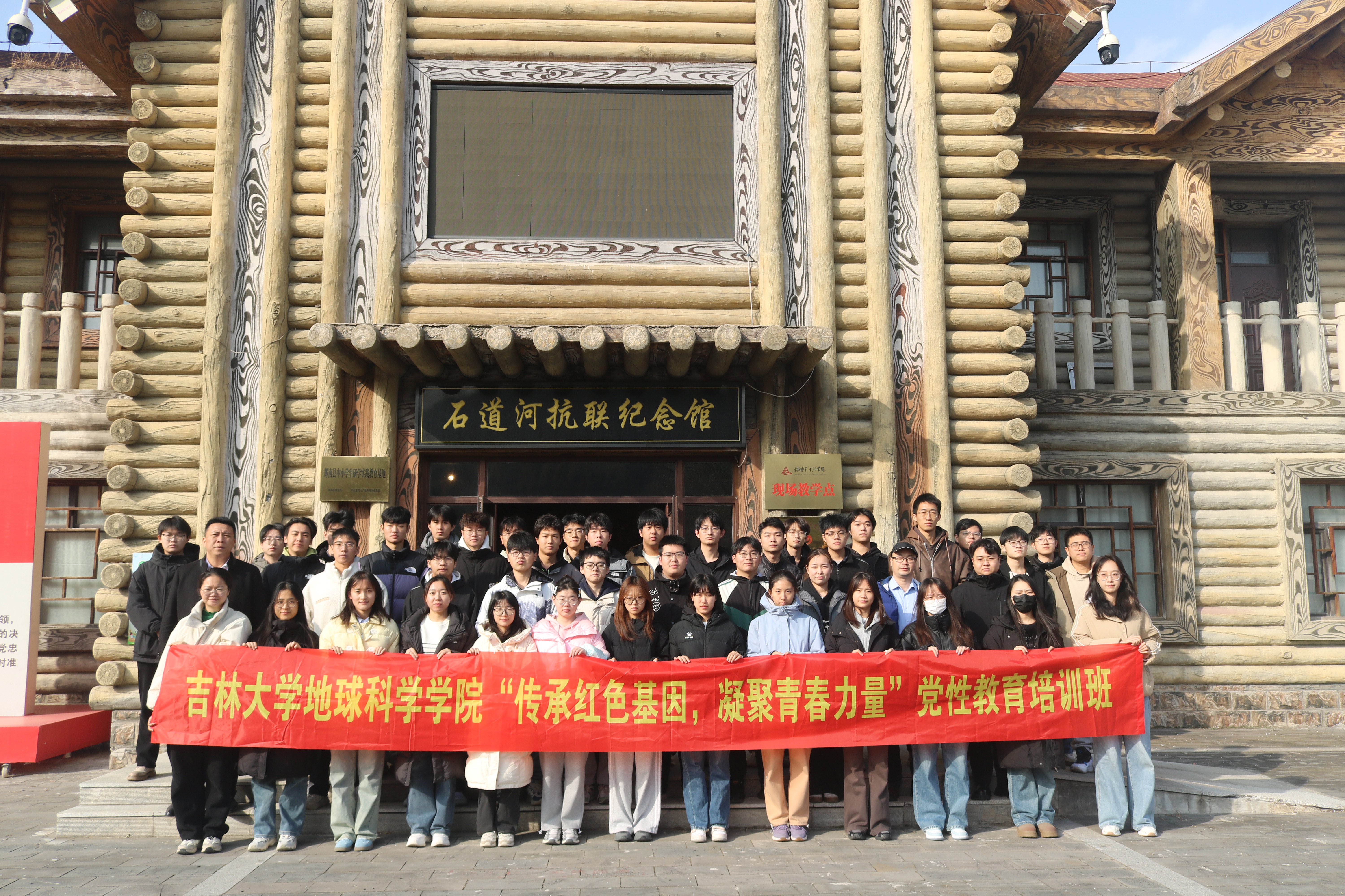 参训师生党员在石道河抗联纪念馆前合影