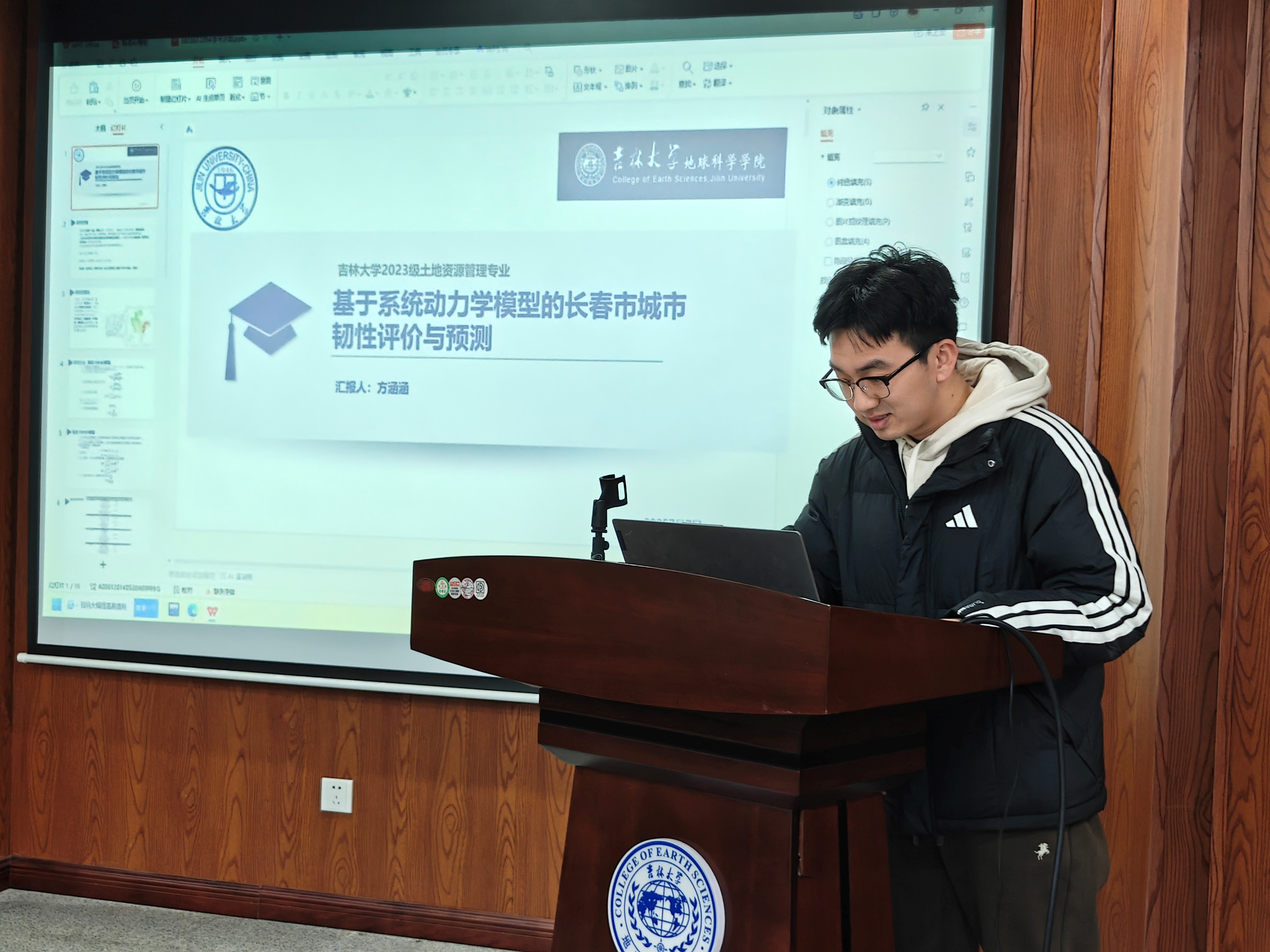 活动上,孙迪以径流模拟为技术支撑,探究了松花江中下游水资源适应性管理的可行策略;方涵涵借助系统动力学模型,对长春市城市韧性开展了评价分析与趋势预测;张紫燕聚焦长三角地区城市人居环境,深入剖析其网络架构特征及背后的驱动影响因素;卢仕祺针对宝清县粮食作物开展专项研究,完成作物识别的同时对其环境适宜性进行了综合评价;李林泽围绕吉林西部生态脆弱性这一核心议题,揭示了其时空演变规律与内在驱动机制。