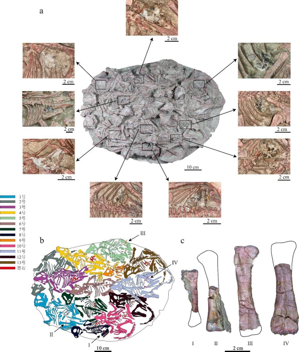 在本项研究中,研究团队描述并研究了收藏在吉林大学地质博物馆、吉林大学恐龙演化研究中心(dinosaur evolution research center,DERC)的一窝呈集群保存状态的Psittacosaurus化石(JLU DERC-Z0007)。该标本产自辽宁省北票市陆家屯义县组地层,包含了13具保存完整的鹦鹉嘴龙幼体,它们来自同一巢穴,骨骼连接完好且朝向一致,属于原地埋藏的集群化石(*这件特殊的化石被研究人员戏称为“十三太保”,后续将有相关科普文章推出)。研究方法聚焦于个体发育以及进食行为的解析。利用对消化系统中的石块进行了详细检测,以验证其是否属于胃石;利用组织学的方法,判断化石所处的生长发育阶段,及其是否经历了姿态转换。