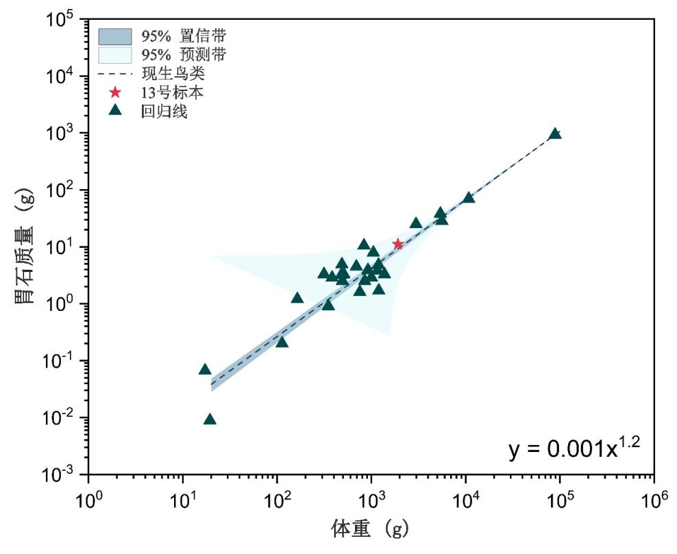 (Supplementary Figure 3) 鸟类和Psittacosaurus (JLU DERC-Z0007,13号标本)的体重与胃石质量的回归线.