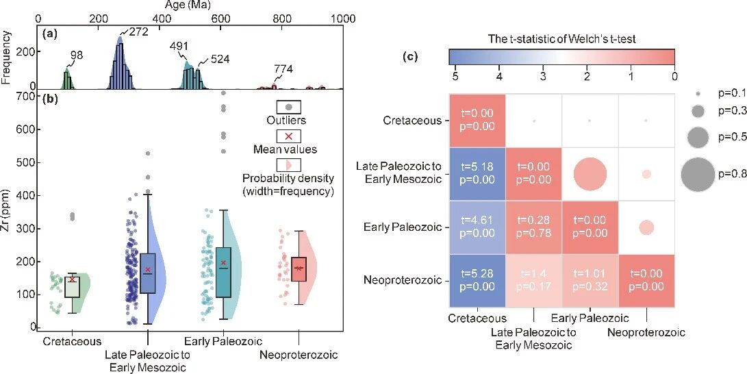 图2 (a) 佳木斯地块花岗质岩石的年龄概率分布曲线;(b) 不同时代花岗质岩石锆(Zr)元素含量的箱线图;(c) 不同时代花岗质岩石锆(Zr)元素含量的相关性气泡热图